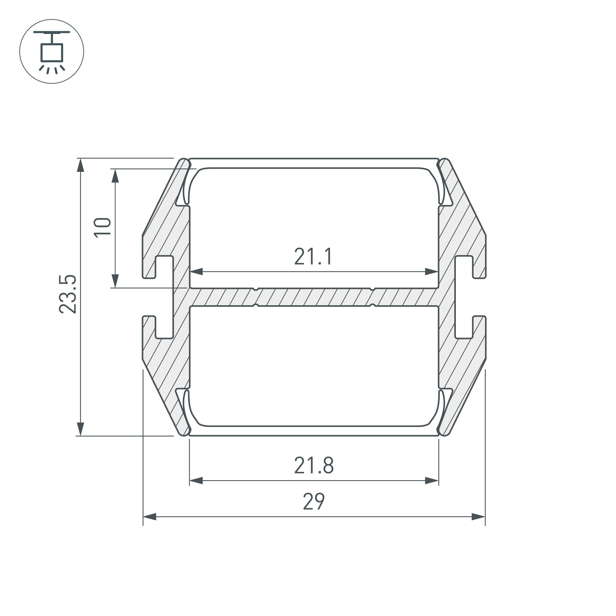 Под заказ от 40 м. Алюминиевый анодированный подвесной профиль с двусторонним свечением (в стороны). Габаритные размеры (L×W×H): 2000x29x23,5 мм. Ширина площадки для ленты 21,1 мм. Для двух лент шириной до 20 мм. Экраны, заглушки и другие аксессуары приобретаются отдельно. Цена за 1 метр.
